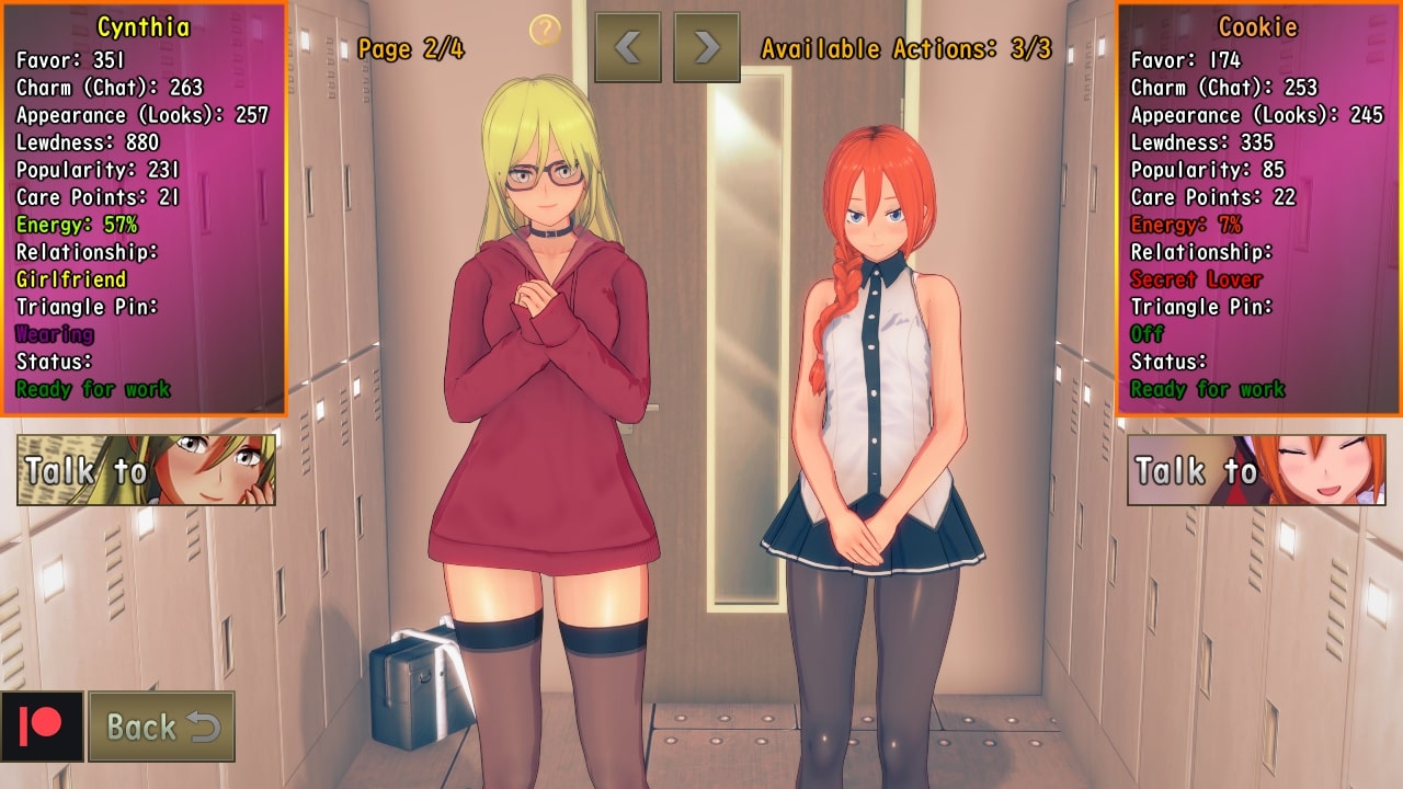 Каждый день вам придется заботиться о клиентах, а также поддерживать хорошие отношения со своими коллегами, чтобы разблокировать специальные мероприятия. Здесь вы можете найти милые или полезные сцены и непристойные анимированные сцены. Выберите свой собственный путь с Куки, Рейной или Синтией (или всеми тремя из них, если вам повезет, или ни с кем, если не повезёт), и убедитесь, что вы не разоритесь.